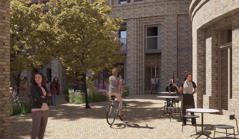 Commercial premises on the ground floor open onto new and enhanced public realm designed by BBUK. This extends along Chalk Farm Road and blends the existing development with the emerging context, through widened footpaths, new seating and planted areas. The addition of a podium garden also helps to maximise urban greening. The development also includes a private roof garden and play and amenity areas at the rear of the site for students and residents.