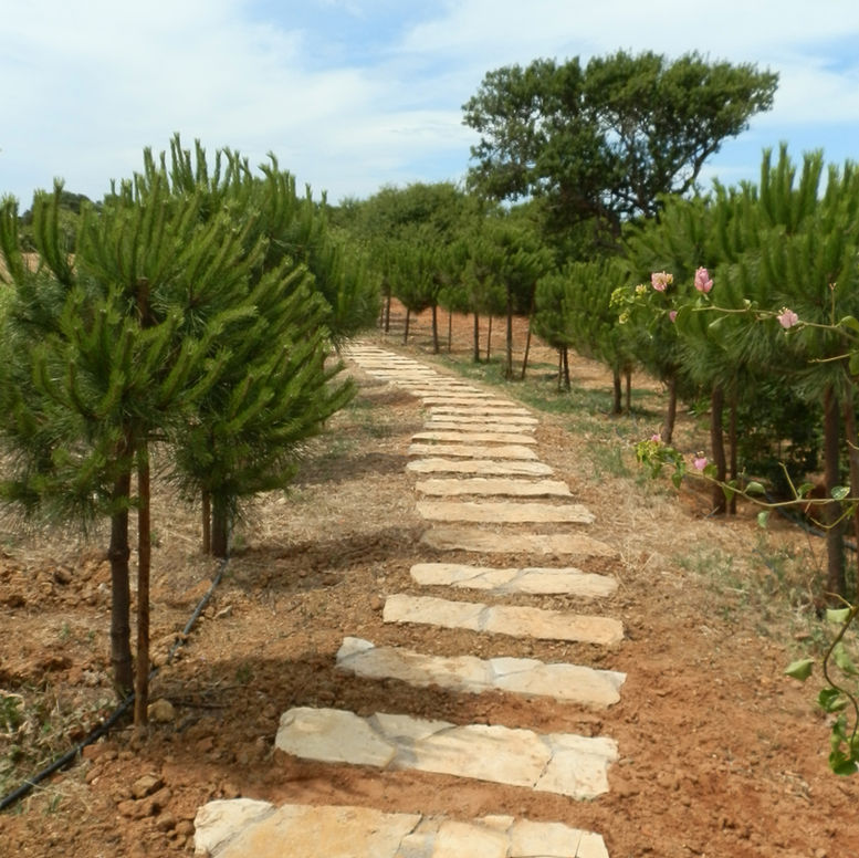The area to the front of the house is planted with an olive grove and an orchard of almond trees, that shelter the dwelling from the road. At the side of the house a planted staircase leads down to a pool where a new pergola planted with white bougainvillea frames the views towards the sea while also offering privacy. The garden is enclosed on the other side by another pergola where more formal planting is set into a large lawn. This space is divided from the wider landscape by a ha-ha and drystone wall were a new steppingstone path gives onto a meadow of grasses and wildflowers that leads into the rocky hillside terrain beyond. On the Eastern boundary a new bespoke playhouse and trampoline were built in their own garden for the children.